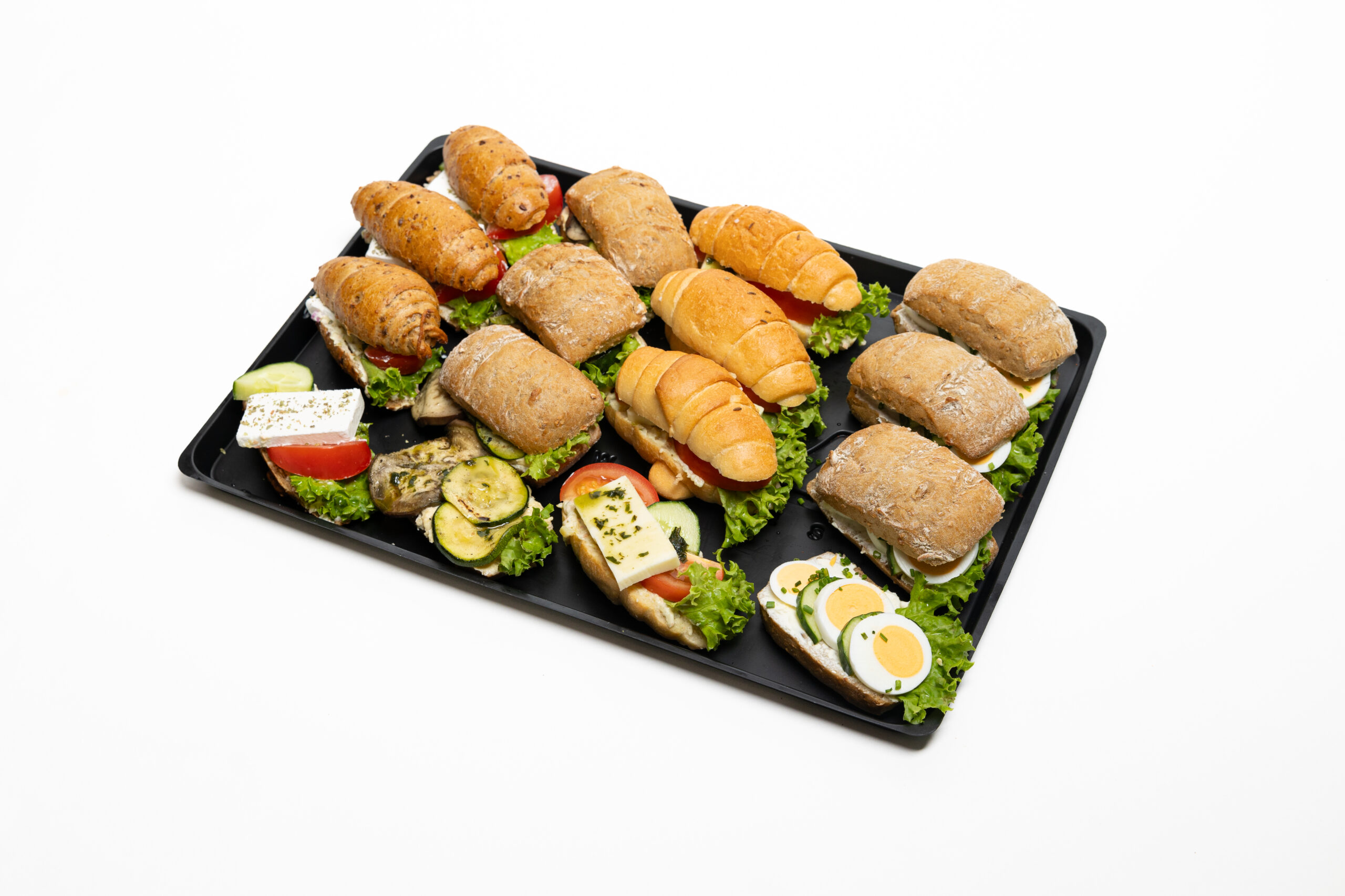 Jourgebäck gefüllt: 4x Mozzarella, 4x Schafkäse, 4x Ei-Scheiben, 4x Grillgemüse auf Humus